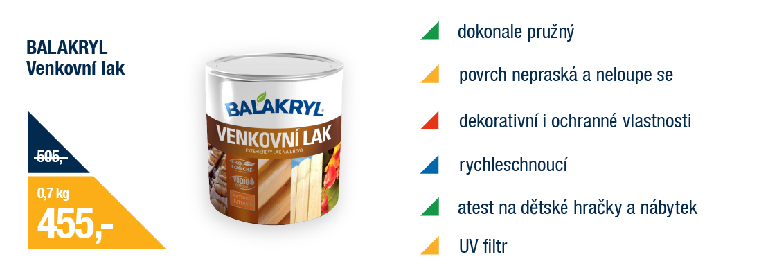 Vodou ředitelný, rychleschnoucí a ideální na ven – Balakryl Venkovní lak – chrání před deštěm, sluncem i změnami počasí, aniž by zakryl přirozenou krásu dřeva.
