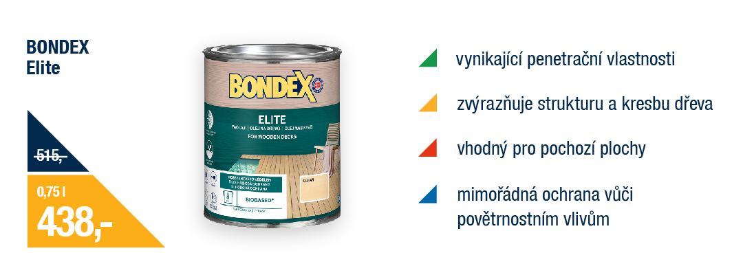Chcete dopřát svému dřevu prvotřídní péči? Bondex Elite je prémiová lazura, která chrání i zdobí. Zvýrazní kresbu dřeva a ochrání ho před sluncem i deštěm. Krása a výkon v jednom tahu.