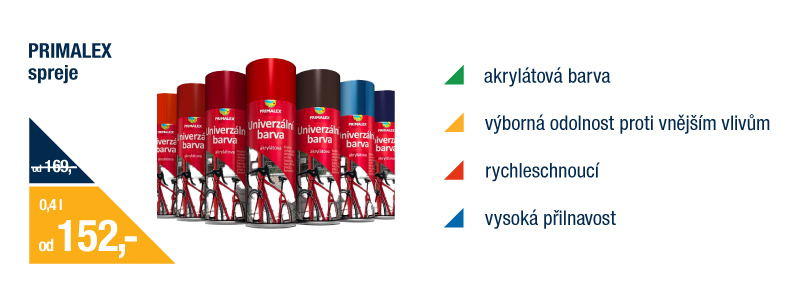 Primalex spreje navíc rychle schnou a vybírat můžete ze široké škály srprejů v různých odstínech. A my vám je po celý prosinec nabízíme s 10% slevou.