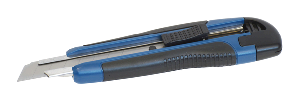 Dvoukomponentní plastové tělo, automatická aretace čepele a kovová vodící lišta.