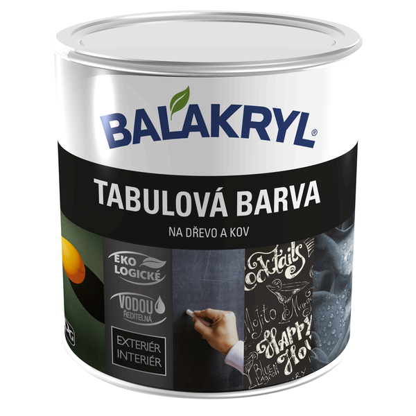 BALAKRYL TABULOVÁ BARVA je vodou ředitelná barva pro povrchové nátěry školních tabulí, pingpongových stolů a jiných povrchů. Je vhodná na dřevo a kov s použitím základního nátěru.
